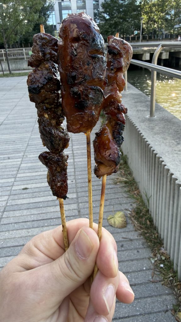 Image Description: Baka (beef), Longganisa (sweet Filipino sausage), and Manok (chicken bbq) skewers from So Sarap NYC.