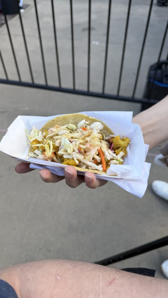 Image Description: a vegan Jamaican taco w/ cauliflower and chickpeas from Wah Gwaan.