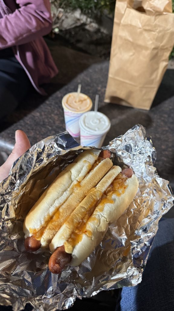 Image description: Two hot hogs from Gray’s Papaya wrapped in aluminum foil, with papaya and piña colada drinks resting on a stone bench, next to a young woman in a purple top. Sunday, October 5th 2025.