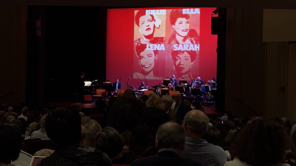 Image Description: an image of a jazz band onstage, with a projected image of Billy Holiday, Ella Fitzgerald, Sarah Vaughn, and Lena Horne.