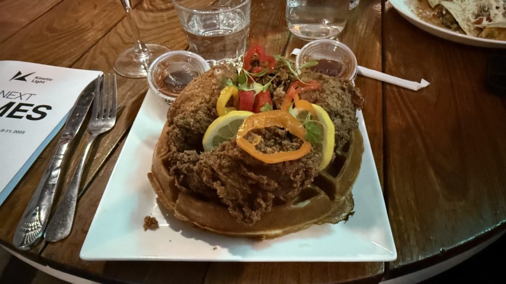 Image Description: a plate of chicken and waffles, garnished with lemon slices and pickled bell peppers.