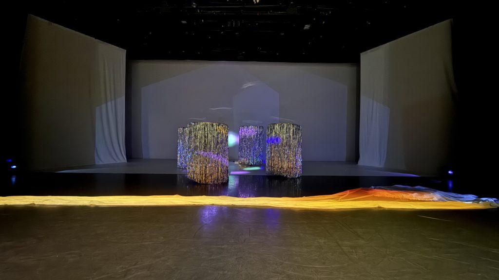 Image Description: a stage with three screens at the rear, and 4 tables with shiny tassels hanging from them.
