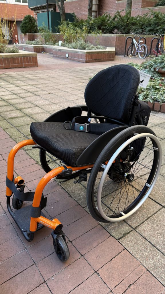 Image Description: a brand-new TiLite Z ultralight wheelchair in Tangerine Metallic with black hardware and a Smartdrive MX2+ Power Assist system, in a courtyard in lower Manhattan. December 3th, 2025.