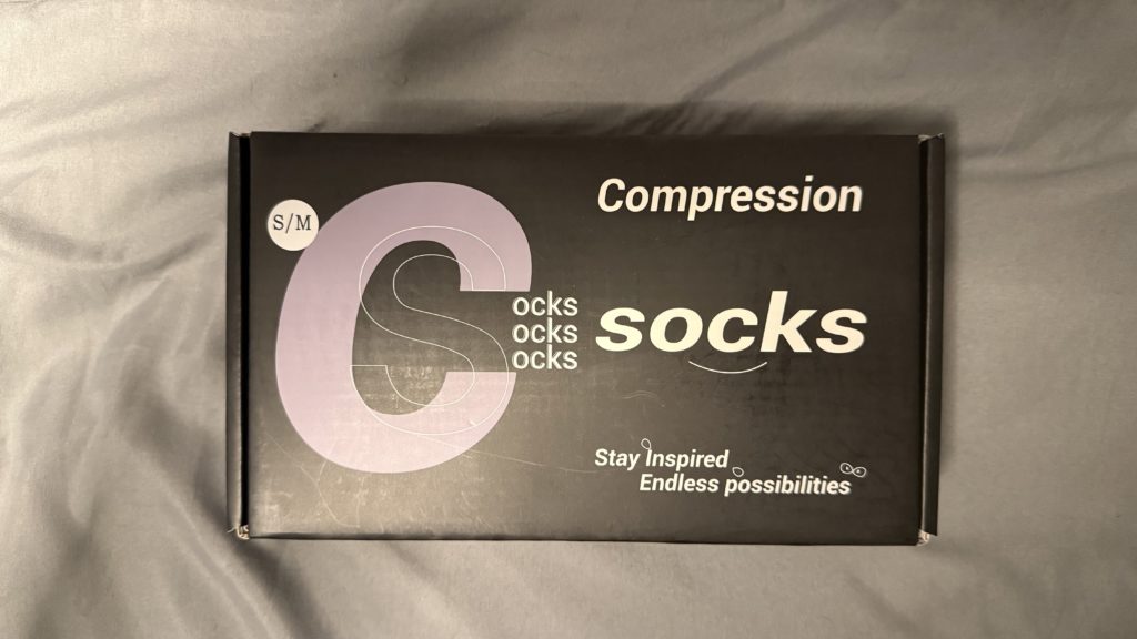 Image Description: a black box poorly labeled and in broken English, which reads “Compression Cocks Socks”.