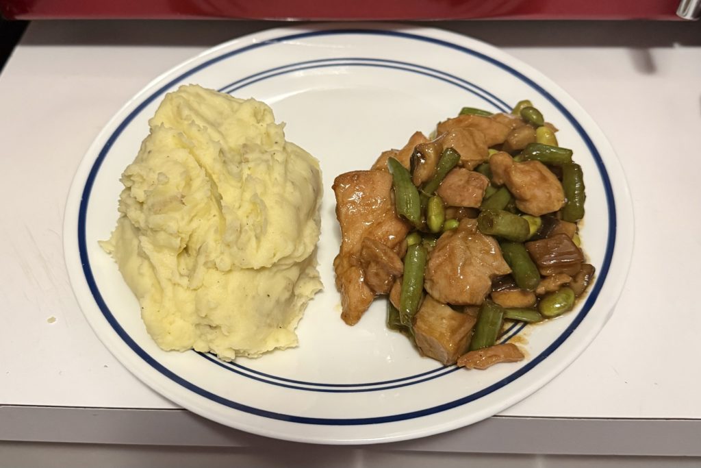 Image Description: Trader Joe’s Shiitake Mushroom Chicken (dark meat chicken, green beans, edamame in a soy-ginger sauce) and rustic-style Yukon Gold mashed potatoes.