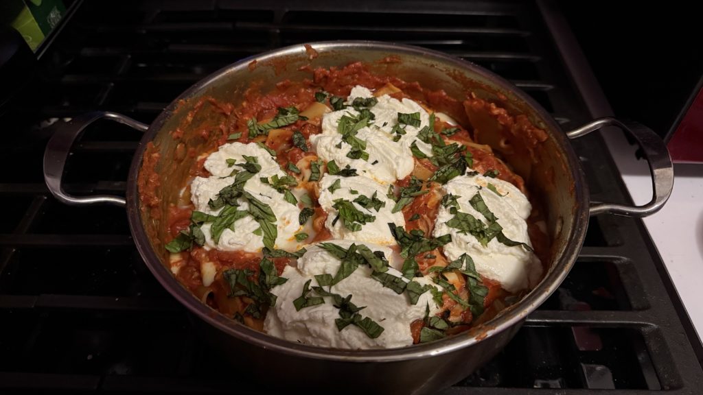 Image Description: a wide, medium-depth skillet rests on a stovetop. In it is a one-pot pasta dish that consists of broken lasagna noodles, tomato sauce, parmesan cheese, mozzarella cheese, ricotta cheese, and fresh basil.