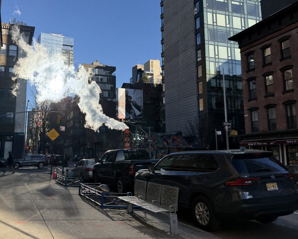 Image Description: the view at Spring Street and Greenwich looking east, with steam rising from an orange-and-white stack. Saturday, March 14th 2026.