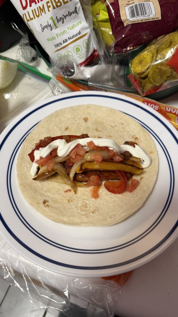 Image Description: a fajita consisting of Korean BBQ-flavored Spam, bell peppers and onions, fresh tomatoes, pineapple salsa, and sour cream.